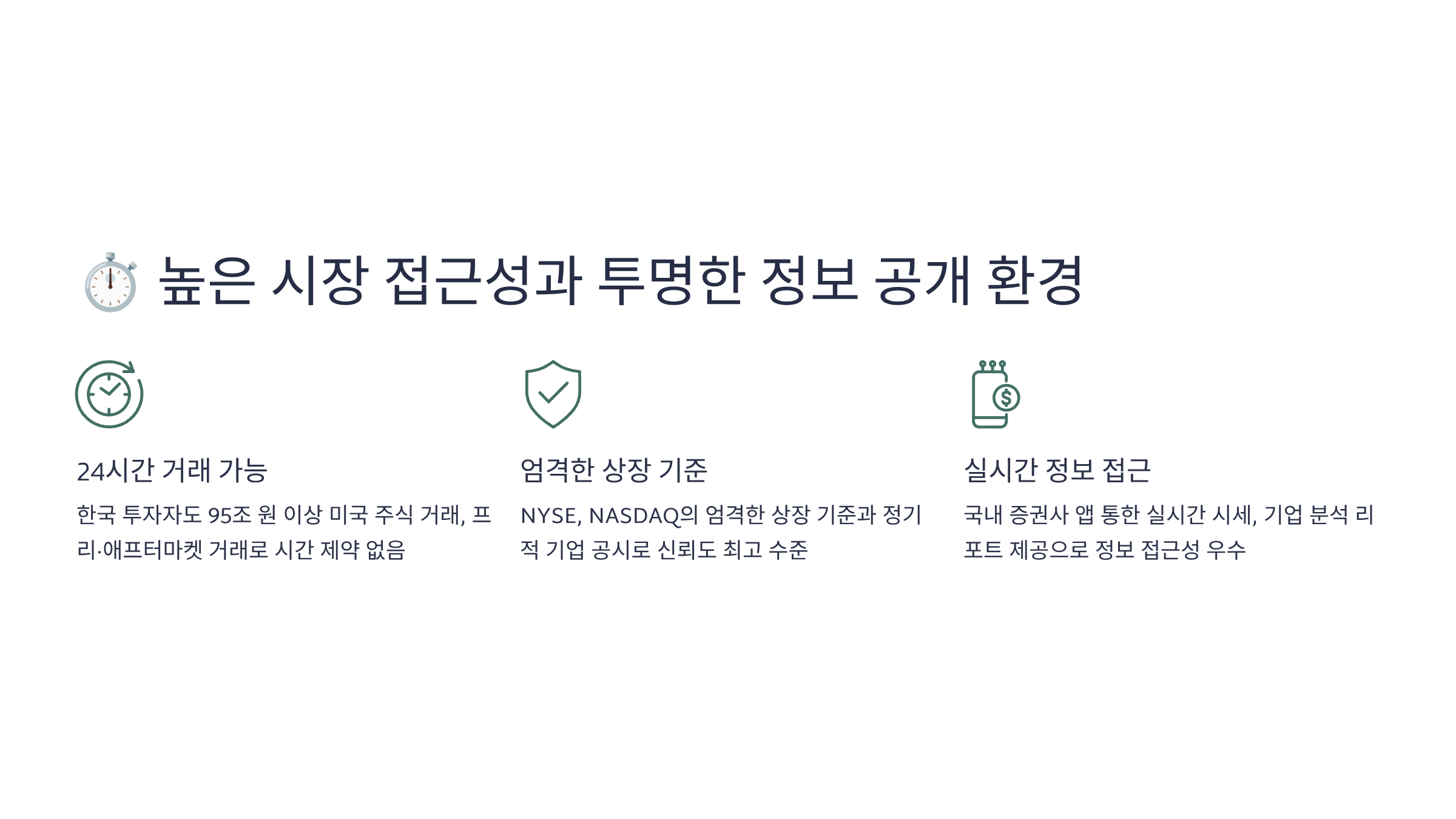 과거에는 어려웠던 해외 주식 투자가 이제는 국내 증권사를 통해 매우 간편해졌습니다. 투자자가 쉽고 편리하게 시장에 접근할 수 있도록 돕는 환경은 투자의 심리적, 물리적 장벽을 낮춥니다.